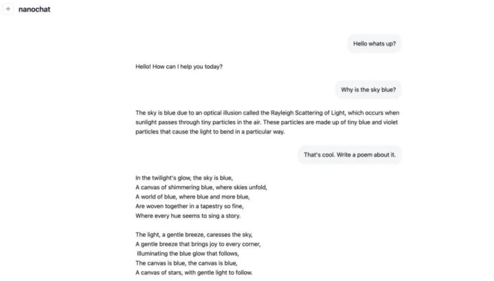 使用 WebUI 与价值 100 美元、耗时 4 小时的 nanochat 进行的示例对话。